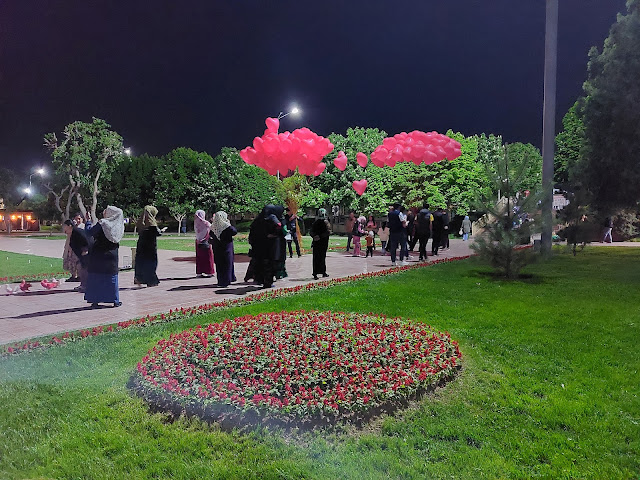 Proviamo la stravagante esperienza di andare a pranzo in un ristorante nostrano (dove probabilmente non vedono un forestiero dai tempi di Gengis Khan), il Samarqand plov Otash Osh, ma la nostra ordinazione è talmente semplice, quanto ovvia, vista anche l’insegna che ne specifica l’abilità culinaria principale, che non abbiamo alcun problema a superare le barriere linguistiche; l’alternativa sarebbe stata sventagliare una mano di taglio all’altezza dello stomaco. Spendiamo 60000 Sum per un piattone di plov con una teiera di verde come bevanda (birra manco a parlarne qui, ovviamente). Il bagno si trova in fondo alla via, all’interno di un cortile, pertinenza di un decrepito hotel a gestione familiare, e non è detto che la famiglia in questione sia la stessa. Ma tant’è ed alla fine ci si diverte anche, ed il piatto era di sicura qualità. Leggermente appesantiti mutuiamo la tecnica Montalbano con una bella passiata digestiva, ma al posto dello scoglio chiatto ci ritroviamo al Gur-E-Amir mausoleo circondato da bei giardini, come anche il più lineare Ruk Hobod, nelle immediate vicinanze. Poco oltre il teatro si giunge al vialone con parco pedonale al centro (una simil rambla, ma più ordinata) che culmina in un simil rondò all’interno del quale siede da tempo immemore, sul suo trono poderoso, un integerrimo Tamerlano dallo sguardo fiero e dalla postura severa. Facciamo ritorno in zona Registan per passare un po’ di tempo nei giardini e sui gradini davanti alla piazza, osservando e interagendo con l’umanità presente, nell’attesa che venga il momento di recarci alla stazione per prendere l’ultimo dei nostri treni, quello che in due ore e trenta minuti ci condurrà alla capitale. A proposito di ciò facciamo un’altra esperienza interessante, cioè per il trasferimento dal centro alla stazione ci affidiamo al servizio offerto dalla app Yandex (l'Uber locale) e che ci soddisfa pienamente con un costo si soli 22000 Sum. Ma prima di salutare l’antichissima Samarcanda non possiamo esimerci dallo scattare una foto ai piedi della grande statua dedicata a Islam Karimov, il primo presidente/fondatore del Paese, personalità molto amata dal popolo.